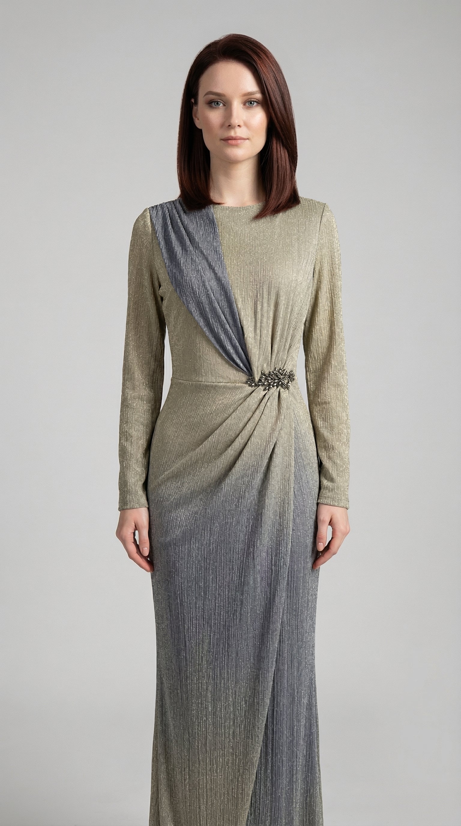 Uzun kollu tasarımı güçlü ve asil bir görünüm kazandırırken, hafif ışıltılı dokusu özel davetlerde zarafeti ön plana çıkarır. Minimal ama etkileyici tasarımı sayesinde zamansız bir şıklık arayan kadınlar için ideal bir seçimdir.