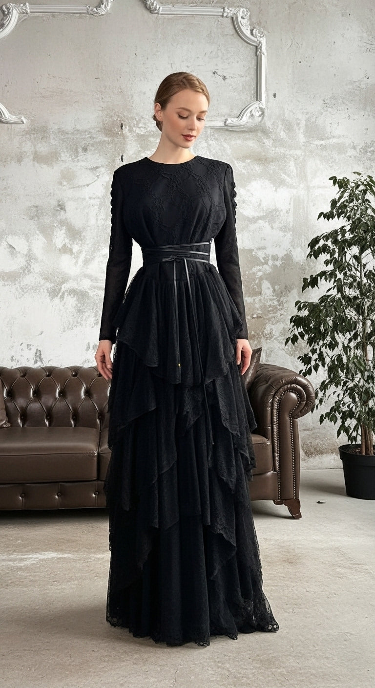 Zarafeti katmanlı dokusuyla buluşturan Lunéa Katmanlı Dantel Uzun Abiye Elbise, romantik ve sofistike bir stil arayanlar için tasarlandı.