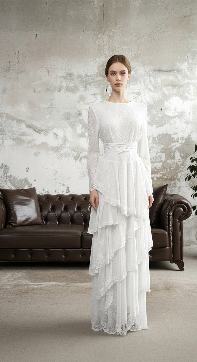 Dantel detaylarla zenginleştirilmiş uzun formu, kat kat inen etek yapısıyla hafif ve akışkan bir siluet oluşturur.