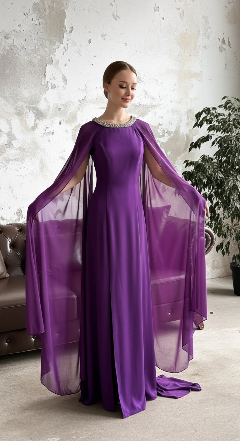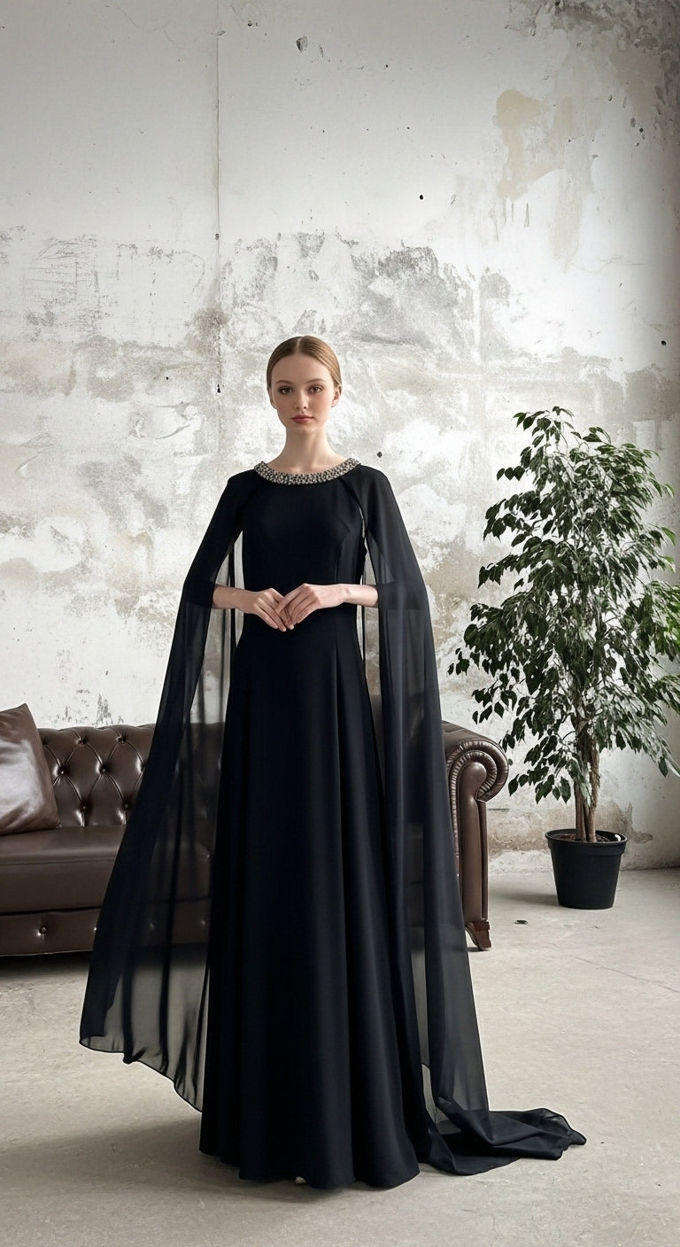 Güçlü duruşu ve zamansız tasarımıyla NOIRÉ, modern şıklığın en sade halini yansıtır. Akıcı kesimi vücudu nazikçe sararken, omuzdan dökülen transparan kol detayı elbiseye dramatik ve sofistike bir hava katar.