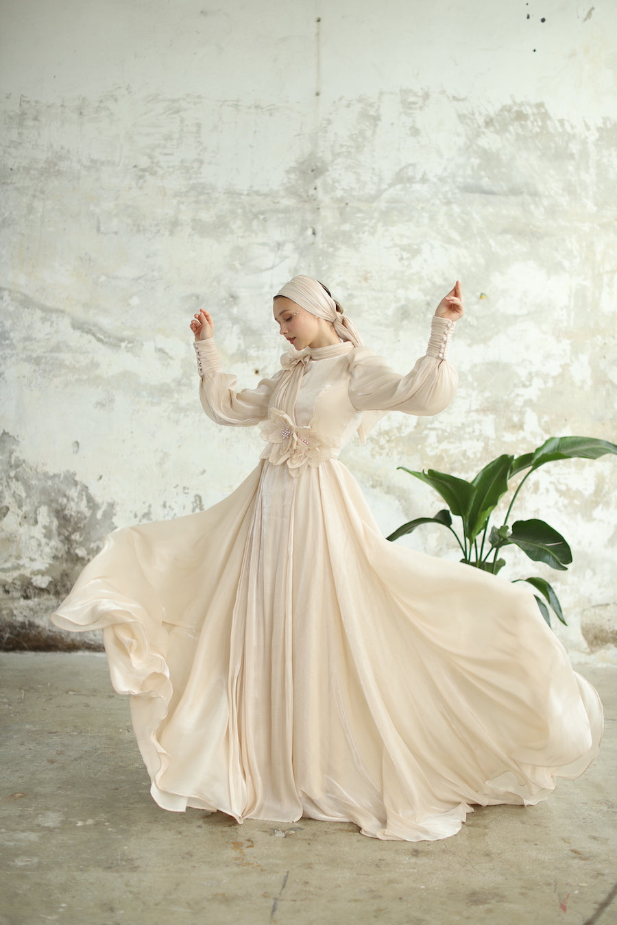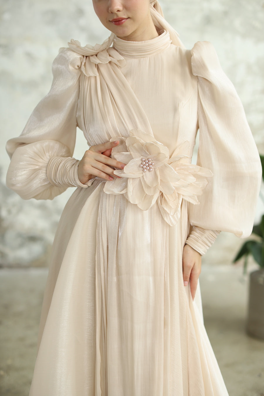 Çiçek Detaylı Manolya Elbise Bej