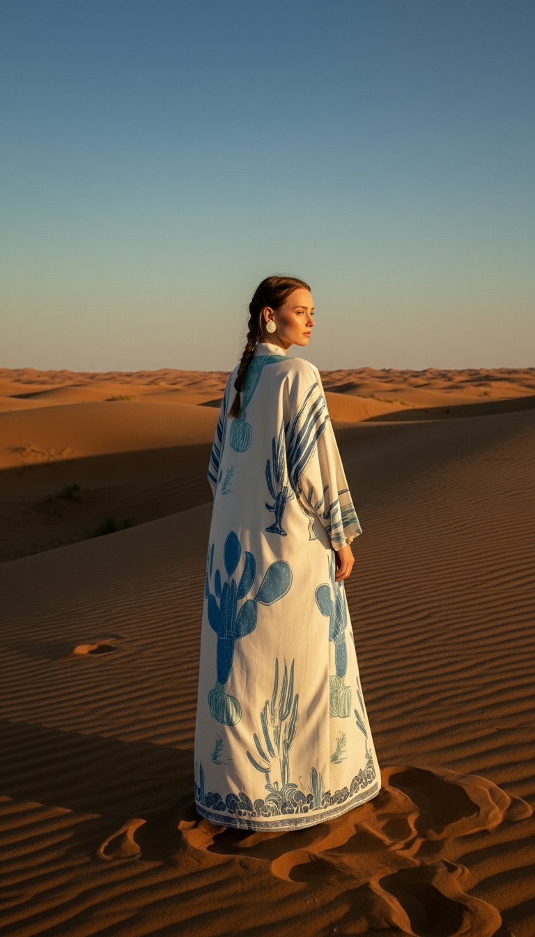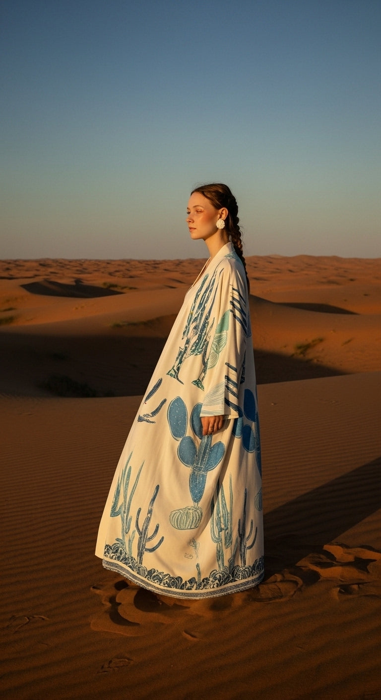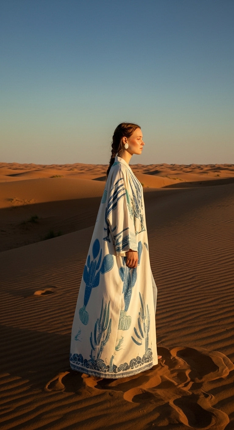 Doğallığın zarafetle buluştuğu Keten Karışımlı Kaktüs Desenli Kimono, stilinize sanatsal bir dokunuş katıyor. Üzerindeki mavi tonlu kaktüs desenleri ve özel el işlemesi detaylarıyla, her ortamda fark edilmenizi sağlayacak eşsiz bir parça.