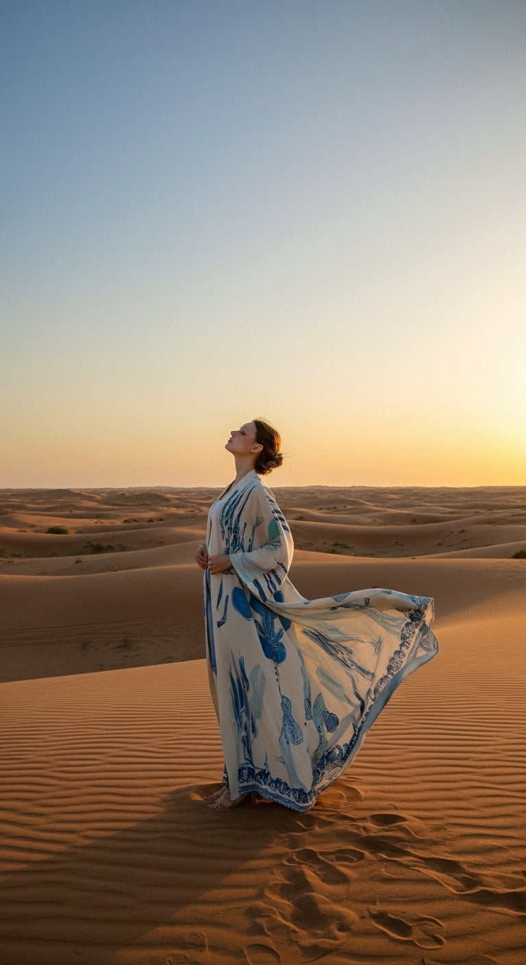 Keten karışımlı kumaşın nefes alan yapısı sayesinde en sıcak günlerde bile ferah kalırken; rahat, bol ve dökümlü kesimiyle özgürce hareket edebilirsiniz. Gün batımı yürüyüşlerinden şık davetlere kadar her ana uyum sağlayan bu kimono, kendinden kemerli yapısıyla stilinizi kişiselleştirmenize olanak tanır.