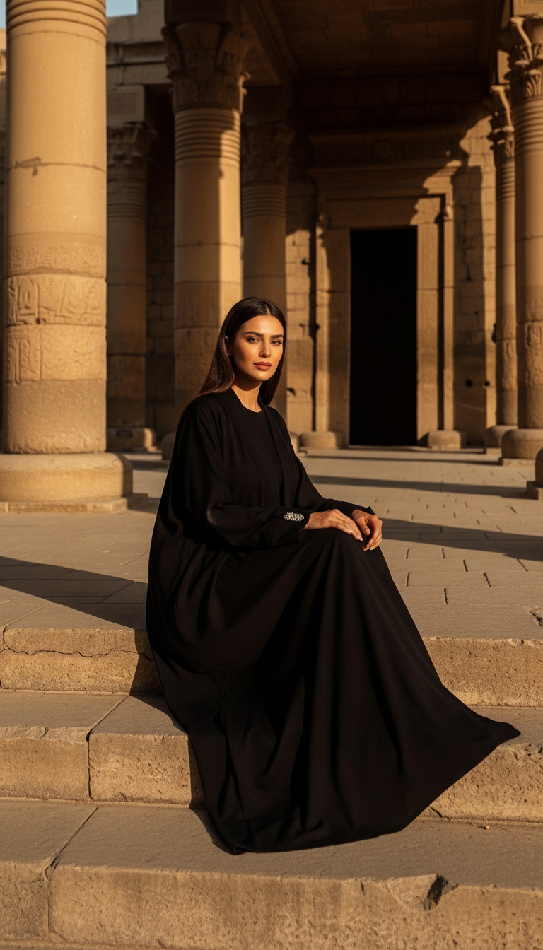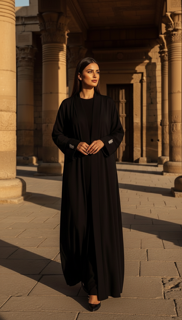 Bu uzun siyah kimono, tek parça tasarımıyla akıcı ve bütüncül bir siluet sunar. Mat ve dökümlü kumaşı sayesinde ışığı yumuşak biçimde emer; abartısız ama etkileyici bir duruş oluşturur. Hareket ettikçe akış kazanan geniş formu, hem konfor hem de sofistike bir görünüm sağlar.