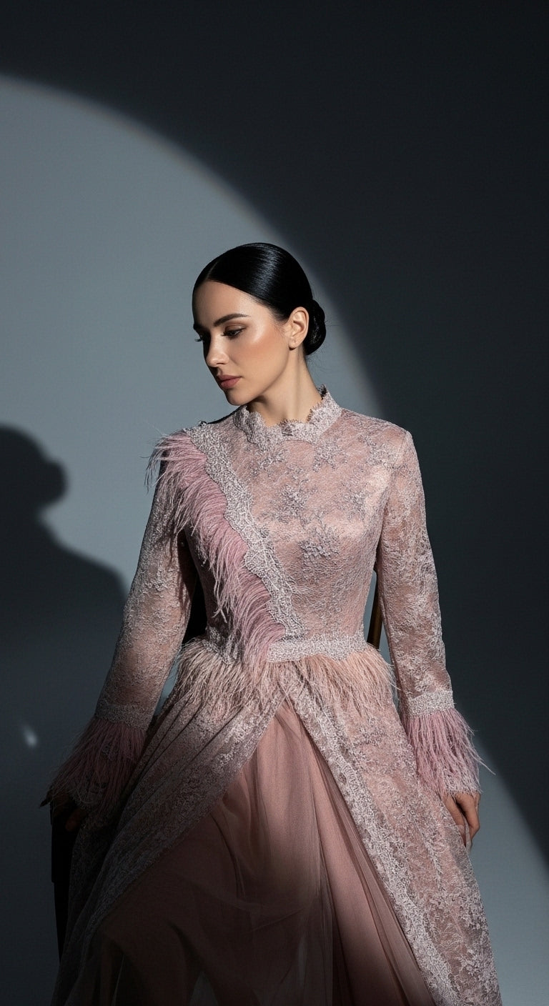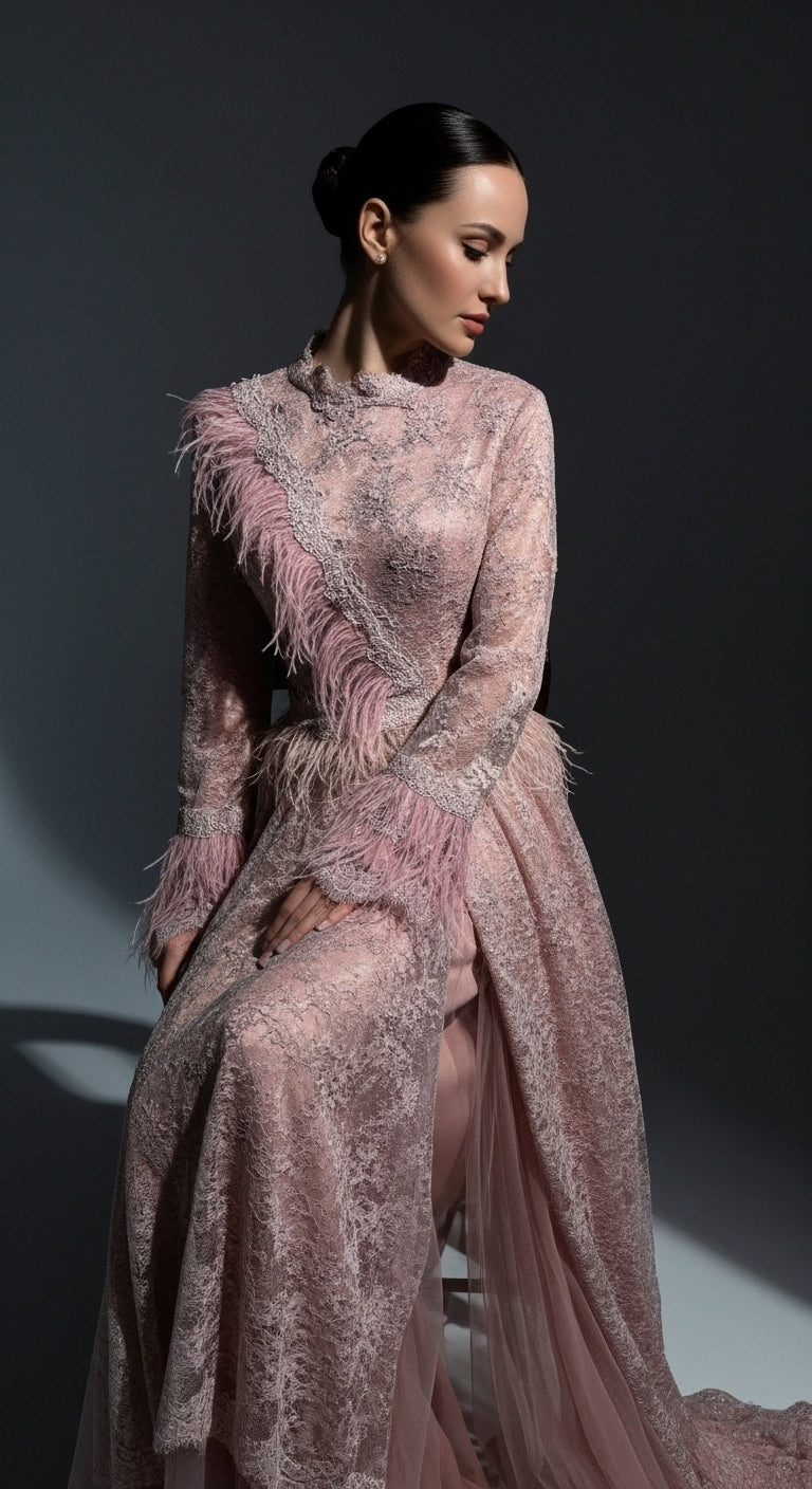 Işıltılı dokusu ve ince işçiliğiyle lüks bir görünüm sunarken, tüy detayları elbiseye sofistike ve feminen bir hava katar.