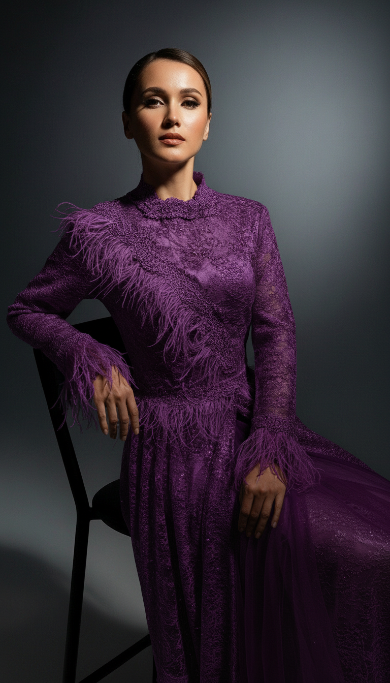 Tüy Detaylı Simli Abiye Elbise – Uzun Kollu, Zarif ve Özel Tasarım